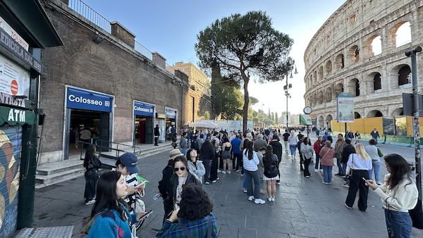 이제 약속장소인 콜로세오역 앞 가판대이다. 역시나 사람이 많았다. 특히 오늘은 월의 처음 일요일이여서 모든 성당, 박물관 등이 입장료가 무료라고 하여 더 사람이 많은 것 같았다. 입장을 기다리는 줄이 콜로세움을 한바퀴를 두르고 원형경기장정도까지 줄이 이어져 있었다. 아래 사진을 보면 콜로세움을 옆으로 줄이 길게 이어져있는게 살짝 보인다.