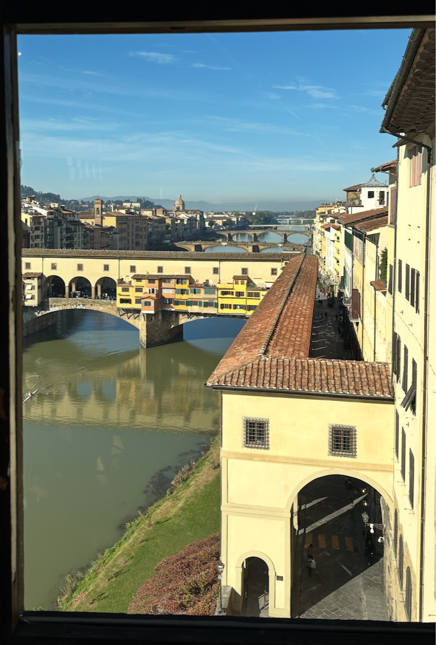 미술관을 한참보고 이제 반대편으로 넘어간다. 회랑 양쪽으로 보이는 풍경이 중세시대로 와 있는 듯한 느낌이다. 아르오 강의 베키오 다리도 보인다. 베키오 다리를 보면 2층 구조인데 아래에만 상점이 있어서 위는 무엇인가 했더니 이곳 베키오 궁전, 우피치 미술관(옛 사무실)에서 피티 궁전으로 이어지는 통로, 회랑이 있다고 한다. 지금은 보수중이라 가볼수 없다고 한다. (다음에 오면 가봐야할 곳이다.)