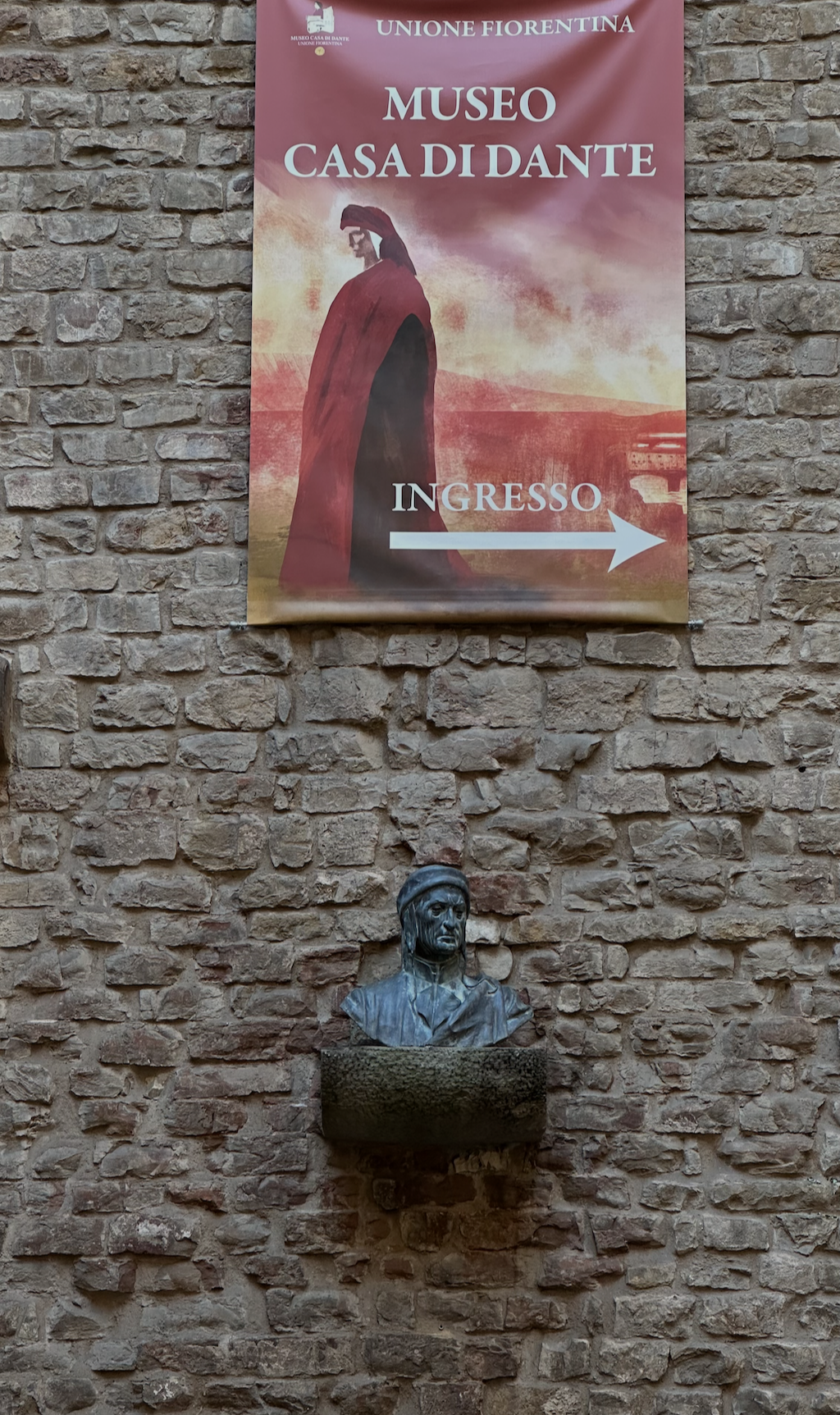 단테 생가 앞에 카페가 있고, 그 사이 바닥에 단테의 모양의 바닥 돌이 있다. 누가 언제 이 돌을 놓았는지는 모르다고 한다. 물을 뿌려서 잘보이게 하고 발을 가져다대고 사진을 찍는 것이 인증샷이라고 하여 우리 가족도 한컷 찍었다.