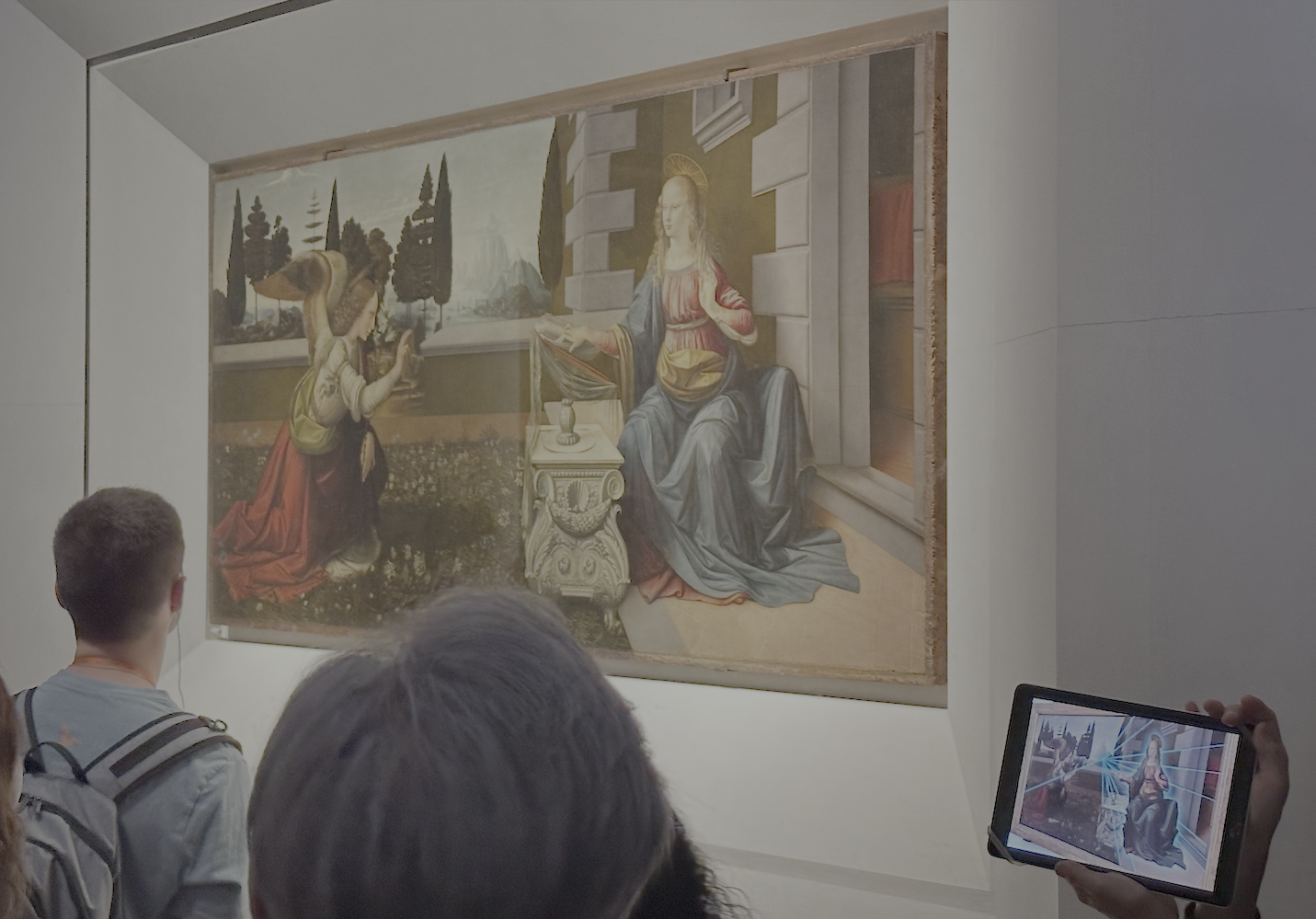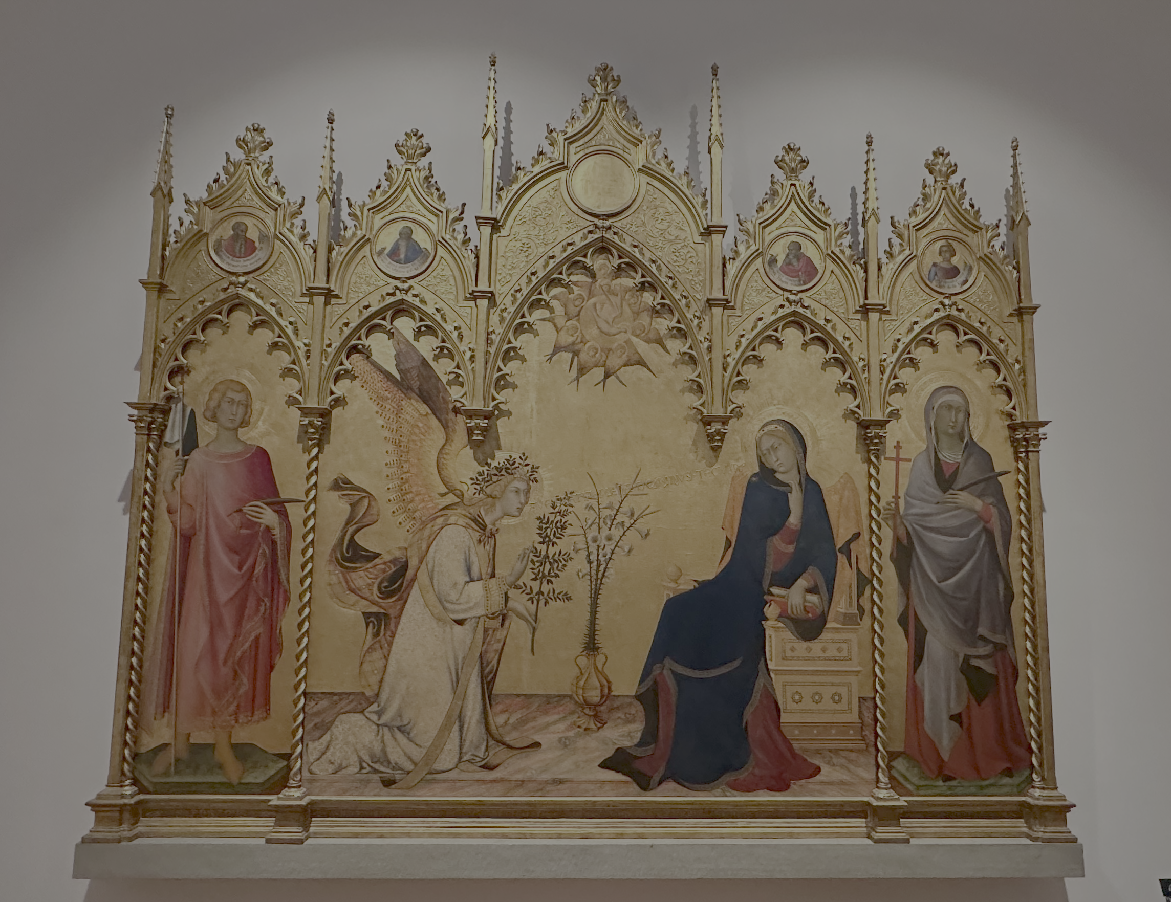 시모네 마르니티의 "수태고지" 이다. 미카엘 천사가 성모 마리아에게 예수님을 잉태할 것이라고 이야기하는 장면을 묘사한 작품이다. 성모 마리아가 있는 그림의 특징은 파란색 망토라고 한다.(바티칸 미술 박물관에서 배운 내용) 그리고 이런 수태고지 작품은 백합이 등장한다고 한다. 그런데 백합은 메디치가문의 적대되는 가문의 문장이여서 천사가 들고 있지 않고 뒤에 장식이 되어 있는 특징이 있다.